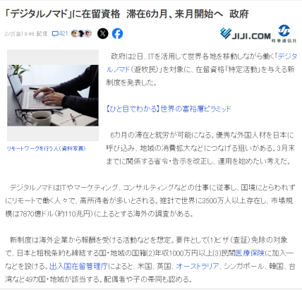 2月2日,日本媒体公布了数字游民签证的政策,将给与满足条件的数字游民在日本逗留和工作6个月,且还能带配偶和子女。