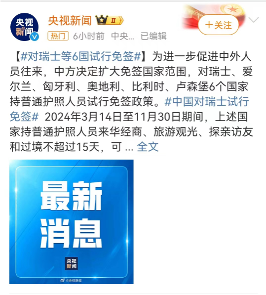 昨天(3月7日)外交部官宣:对瑞士、爱尔兰、匈牙利、奥地利、比利时、卢森堡6个国家持普通护照人员试行免签政策。政策实行时间为2024年3月14日至2024年11月30日。