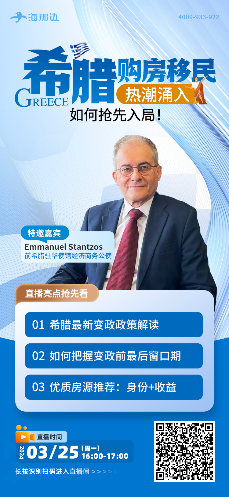 具体实施时间和细节,大家可以关注今天下午直播,我们邀请到了前希腊驻华使馆经济商务公使:Emmanuel Stantzos先生,为大家详细解读希腊黄金签证新政,大家可以扫码加入移民交流群,锁定直播间。