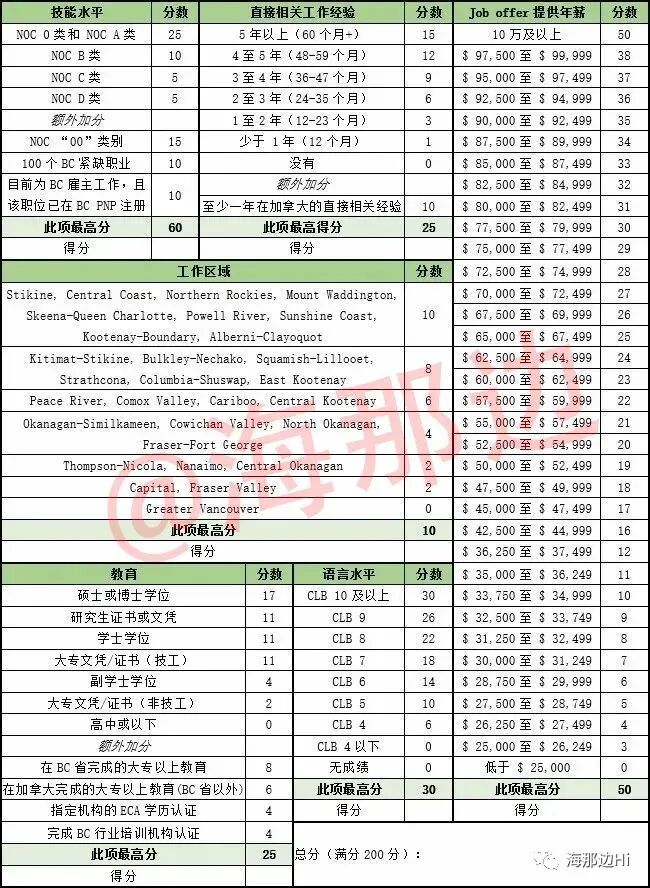 BC省采取的是打分制,只有达到分数了才能获得邀请。满分为200分,一般获批需要达到95-105分左右。