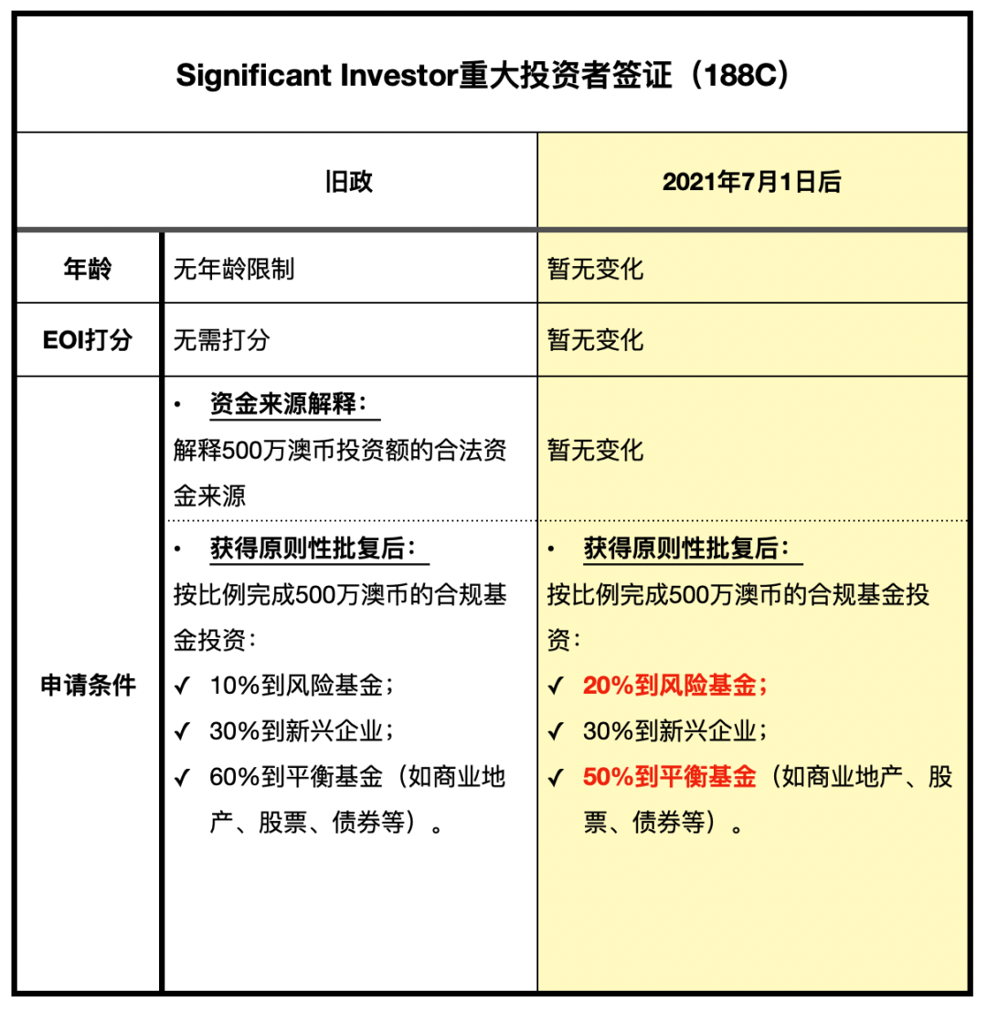 这个签证类别下面有188B和188C,都在2021年7月之后进行了新政改革,一个需要投资250万澳币和通过EOI(商业打分),一个无需商业打分但需要投资500万澳币。