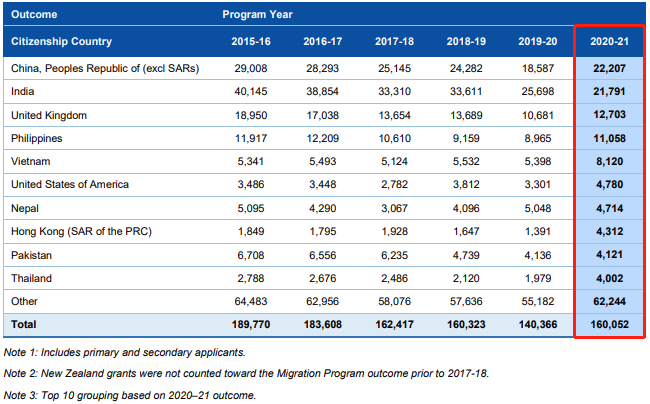 2020到2021年中国大陆的新移民,成为澳洲最大的移民来源,达到了22207人。紧随其后的是印度,达到了21791人。