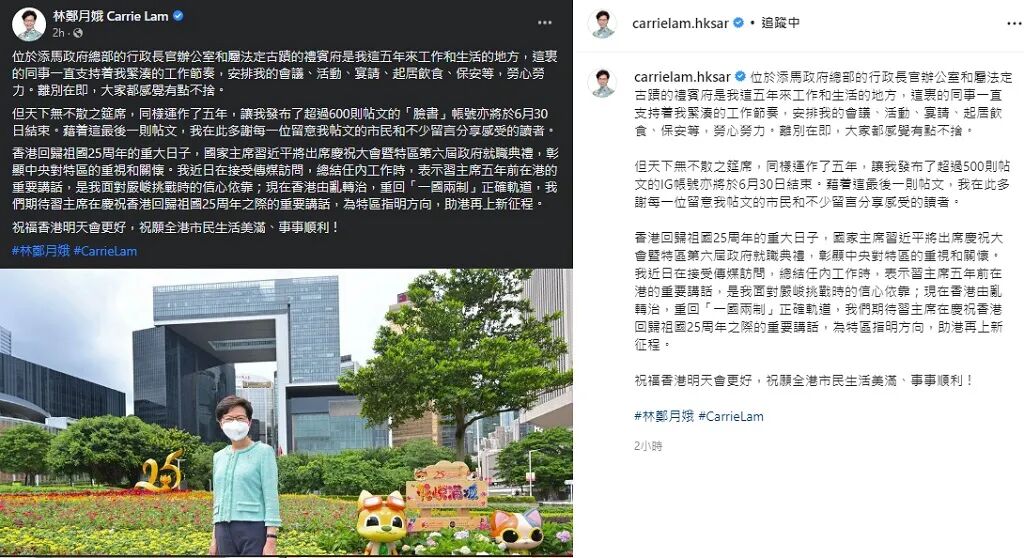 今天是香港回归25周年,也是香港特首的换届日子。上一届特首林郑月娥在6月30日关闭了她的官方“脸书”平台,她表示:“离别在即,大家都感觉有点不舍,但天下无不散之筵席”,并祝福“香港明天会更好”。