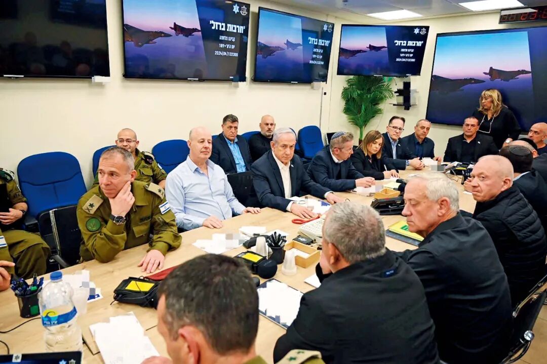 4月14日,以色列总理内塔尼亚胡在特拉维夫的基里亚特军事总部召开战时内阁会议。图/视觉中国