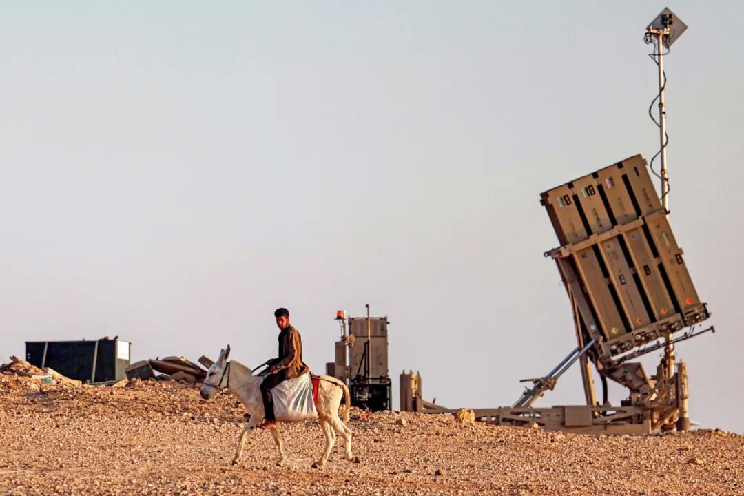 4月14日,以色列南部,人们经过铁穹导弹防御系统的电池装置。图/视觉中国
