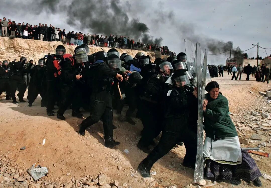 2006年2月1日,巴勒斯坦城镇拉马拉,以色列警察强行拆除阿莫纳定居点时,与犹太定居妇女发生冲突。摄影/Oded Balilty
