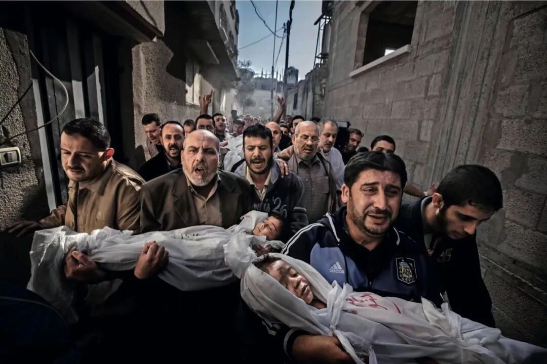 2012年11月20日,两名儿童的遗体被叔伯们抱往加沙的一座清真寺举行葬礼。此前,兄弟二人及其父亲在以色列对加沙地带的空袭中丧生,其母亲被送往医院急救。摄影/Paul Hansen