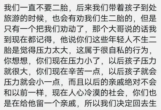 还有网友想要二胎,纯粹是为了在人情冷漠的社会里给孩子留一个亲人,即使现在辛苦点也愿意。