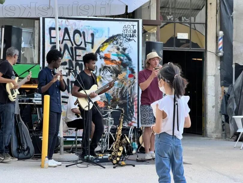 (都都在街头观看音乐表演)