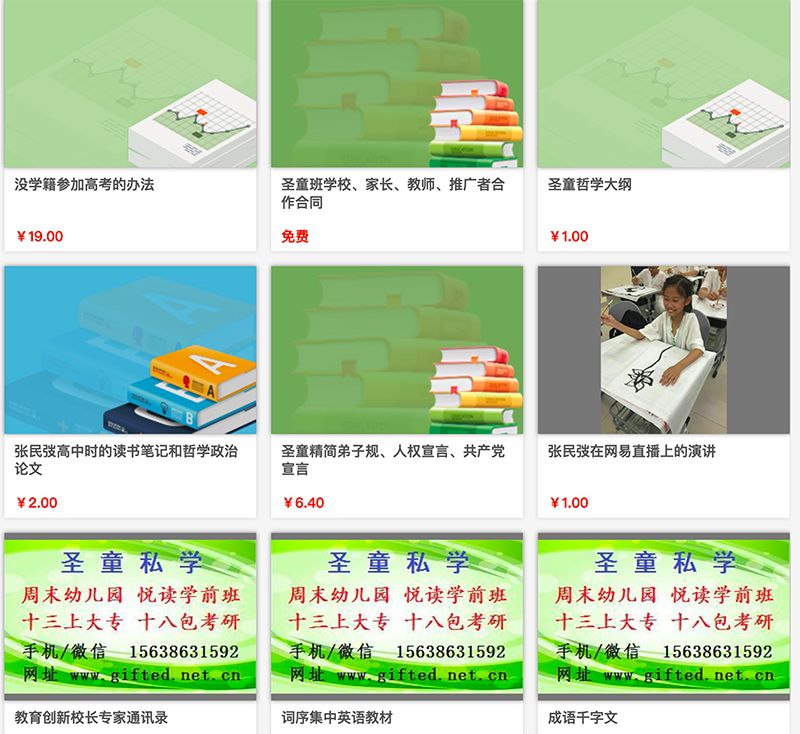 张民弢根据“自己的经验”设计了课程和教材,其中包括《弟子规》、《人权宣言》、《共产党宣言》等,还有他自己的高中笔记、诗词。这些教材还被做成电子版本,通过网络微店售卖,标价在0-99元之间。
