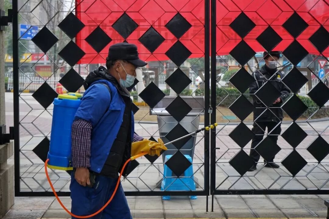 1月23日,武汉市某小区内,工作人员正在进行日常消毒。