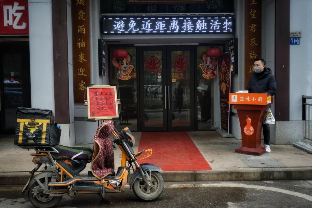 1月23日,武汉市内仍有部分餐厅照常营业。一家餐厅门口立起告示牌,“餐厅已全面进行科学消毒,请大家放心用餐”。