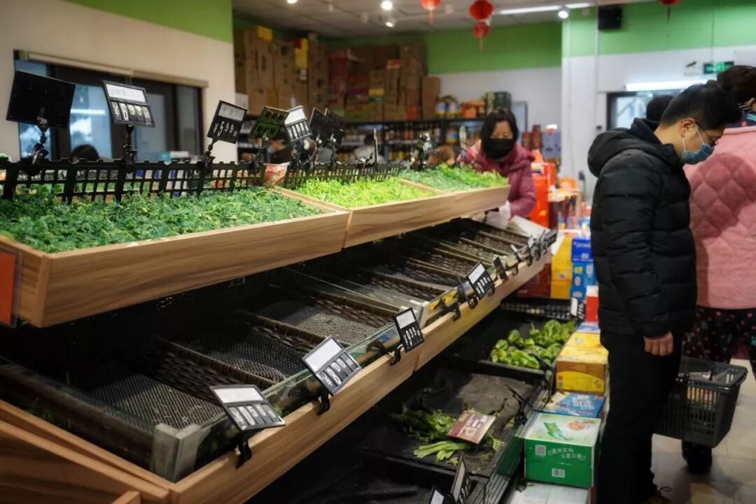 1月23日上午十点,武汉市居民在附近超市购买生活用品,蔬菜在短时间内售罄。