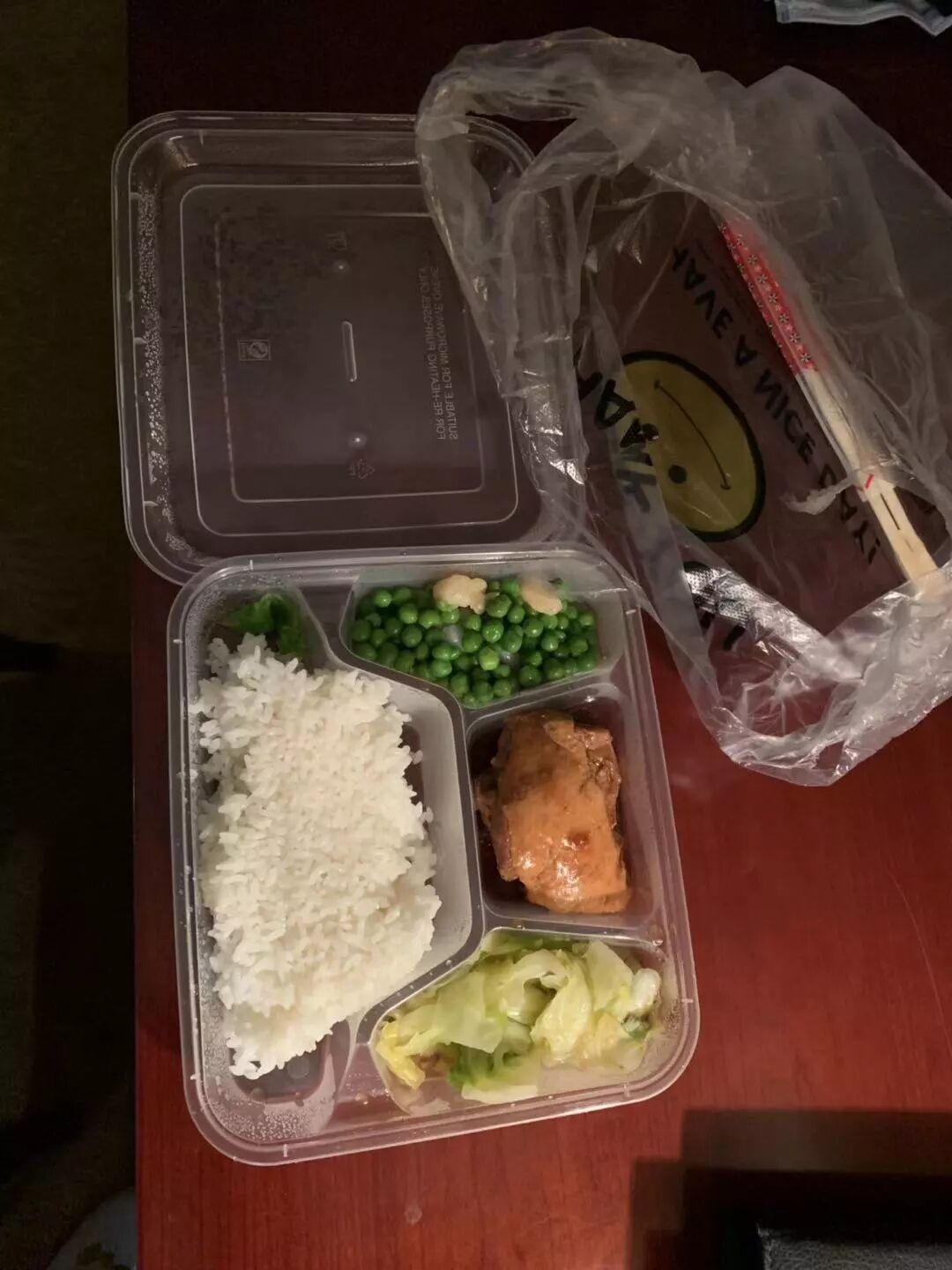 之后,大家在宾馆大厅分开,各自进入房间。午餐很快分发下来,豌豆炒虾仁、手撕包菜、大虾,荤素搭配,还有水果。碗筷是一次性的。自此之后,每日三餐由工作人员统一敲门发放。