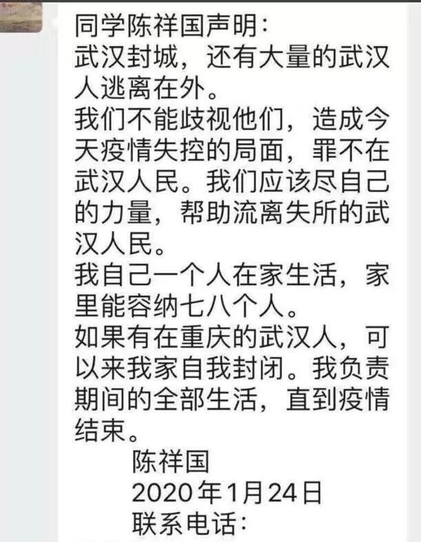 陈祥国儿女都在国外,一个人住在重庆。疫情爆发后,他很少出门。前两天,他留意到,各地开始举报武汉车牌,赶武汉人离乡,不让武汉人住酒店,他觉得“太没人性了”。他瞒着家人,在同学群发了一则信息:武汉“封城”,大量武汉人逃离在外……我一个人在家生活,若有在重庆的武汉人,可以来我家自我封闭,我负责期间全部生活,直到疫情结束。