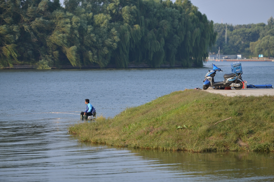 外卖小哥休息时在河中垂钓