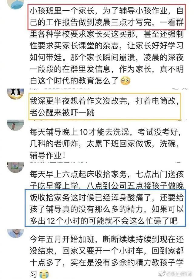 吐槽孩子课业负担重的家长留言。图源自网络。