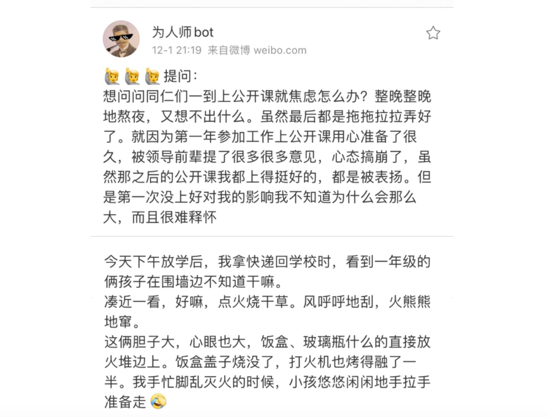 同事给我推荐了微博博主“为人师bot”,里面都是全国各地的老师在吐槽或分享经验。我压力大的时候会看看那个,发现大家都一样惨,这么一比较,心里好受一些。