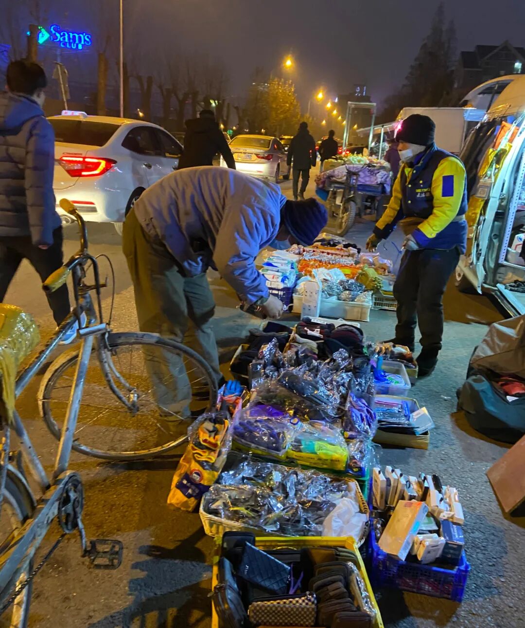 他们没有一个人去过南方,对杭州冬天的想象是温暖、宜人的。留在厂子里的生活单调,晚上下班回宿舍的路上,他们偶尔出来街边买点生活用品。数个面包车到了晚上就停驻在这儿,车厢门一拉就是货品。