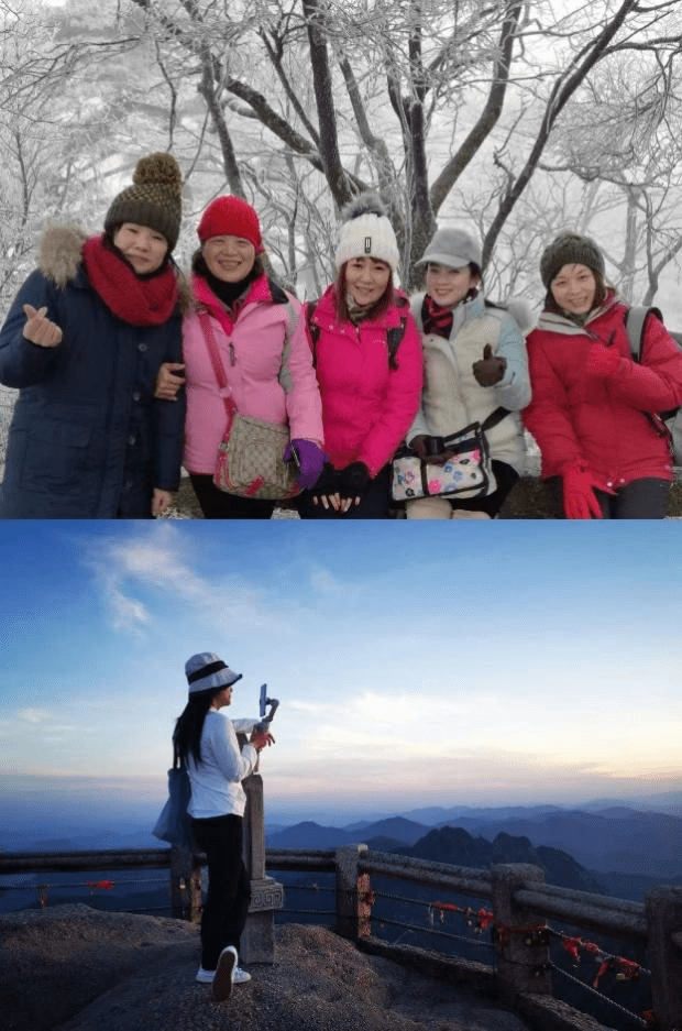 ●上图:疫情前婷婷(右二)带黄山团。下图:疫情后婷婷在黄山直播。