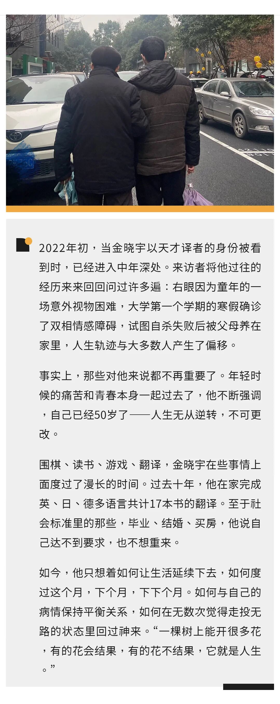 他看到有篇关于自己的文章里写,翻译之于他是“生命中黑暗里的绳索”,其实不是的,他说,围棋才是,“只不过是个爬不上去的绳索,竞争太激烈了。”他在杭州棋院考到过业余二段,但最后也没能拿到职业定段赛的报名资格。金晓宇至今留有遗憾,觉得父母受“破四旧”的影响,不支持他走这条路。