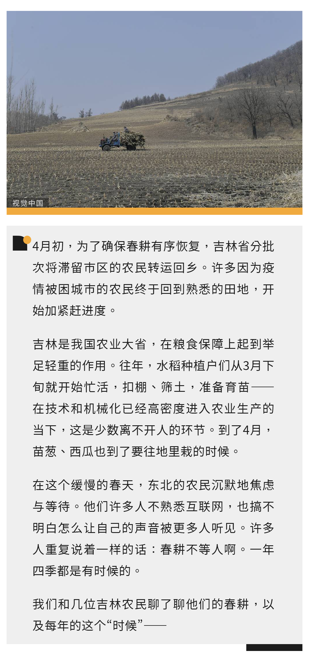注:4月14日,吉林省宣布全省实现疫情防控社会面清零。当天,我们联系到吉林松原一位62岁的玉米种植户,他家里有150多亩地,4月5日就报名返乡,但不知何原因,迟迟没有接到反馈,名字也不在返乡名单上。老人说:“我们老两口跟他们小两口搁家打一天电话了。我都哭了,这太着急了。”4月18日,我们得到消息,老人已经顺利返乡,正在居家隔离。据媒体报道,吉林社会面清零后,此前滞留外地的种植户已经普遍返乡,在春耕正式开始之前,投入备耕工作。
