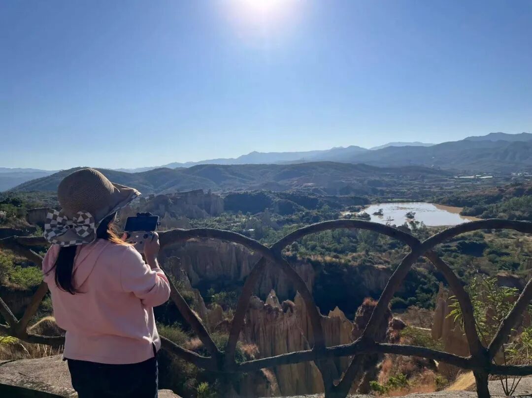 这两年,流量与热度也为苏敏带来稳定收入,她不断改进自己的旅行装备。拍摄设备不断升级,从最开始一部手机升级成三台运动相机,一个无人机,一个360全景相机。在元谋县的土林景区,苏敏熟练操控无人机进行远景拍摄,并且能够找到适合的机位来录制自己的独白。