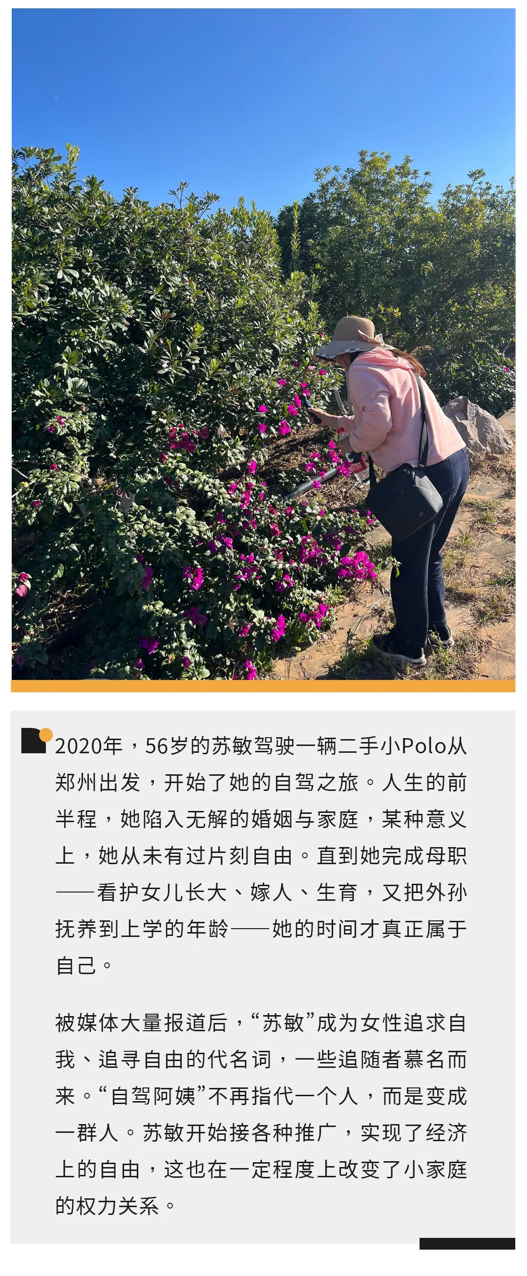 2020年9月的一天,56岁的苏敏驾驶一辆大众Polo从郑州出发,开始了自驾之旅。在此之前,她经历了漫长、压抑的几十年婚姻生活,自驾游算得上一次“出逃”。两年里,她走过大半个中国地图,也收获了百万量级的粉丝。出走后,她从未回过郑州,“家”反而成为另一种远方。