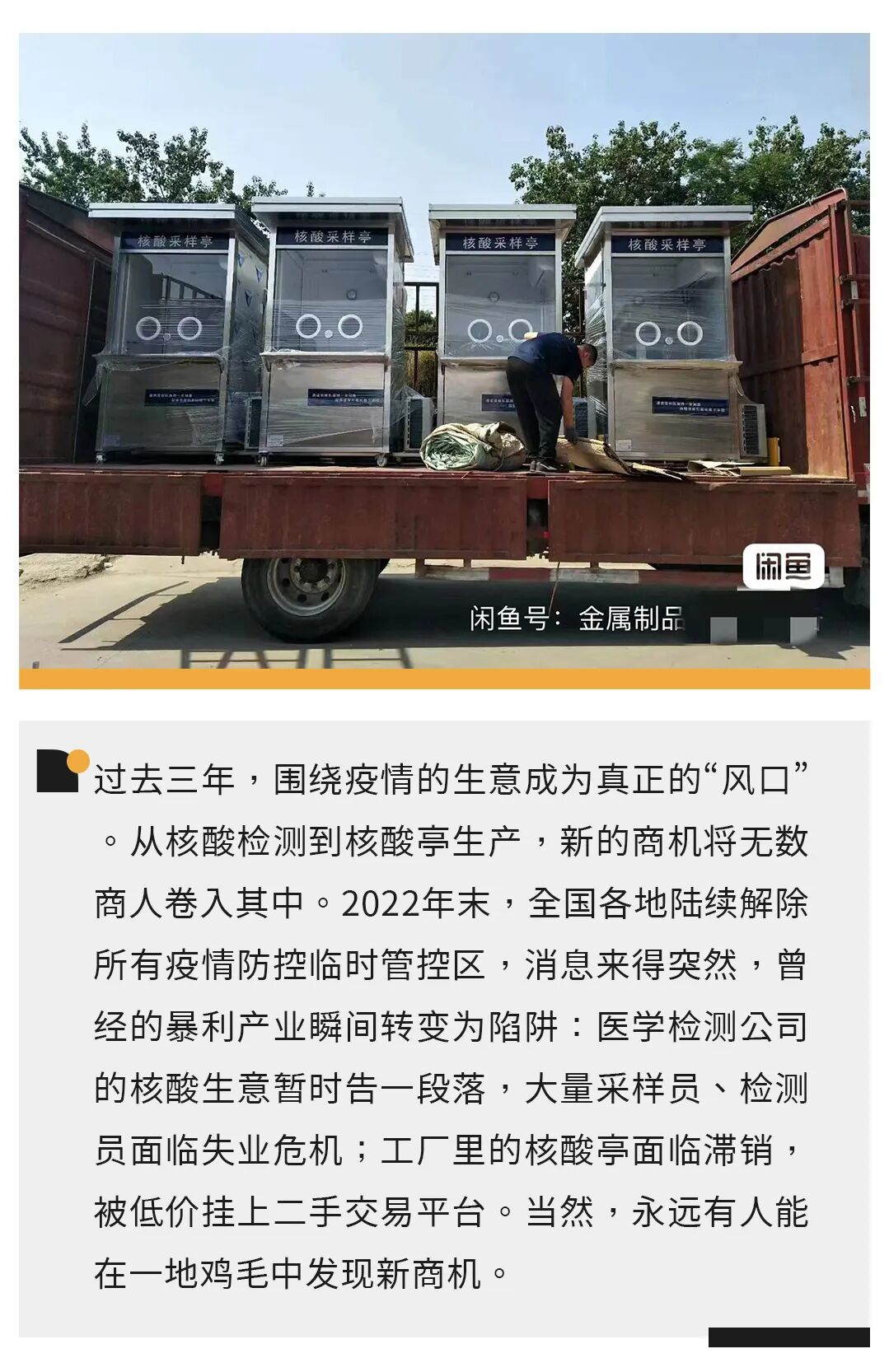 此前,他所在的厂子主要向市场出产两种疫情“物资”,一类是方舱,一种升级改良版的集装箱,如果城市方舱不再需要,他们工厂可以负责回收。经过消毒和改良后,可以再次出售给工地做临时宿舍。另一类就是核酸岗亭,如果被印上了街道广告或者宣传标语,处理起来很麻烦,工厂不再提供回收服务,但可以帮顾客“代卖”,挂上二手交易平台。