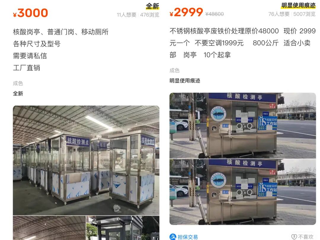 如果你在闲鱼上搜索关键词“核酸亭”或者“采样岗亭”,能看到几十个正在售卖的用户,IP地址遍布多个省份,江苏、广东、陕西、湖南、内蒙古。挂出的价格最低的不到一千块,有些卖家甚至愿意支付运费,“拿去直接用”“废铁价处理”。