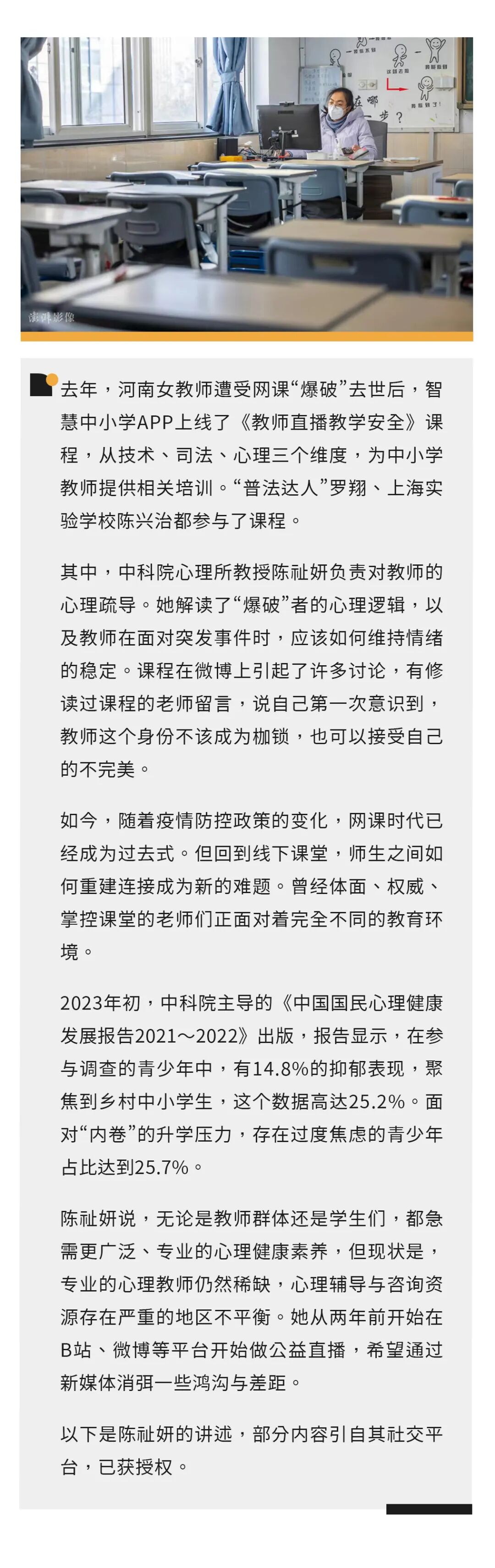 另外,我会明确告诉老师们,他人如何看待你并不能由你决定。同时,并不是说,你遭遇了网课侵入或者被学生投诉,就意味着你是一个坏的老师。这里面有很多影响因素,家庭、外部社会,或者学生那段时间情绪不佳,侵入者的行为有他具体的情境。