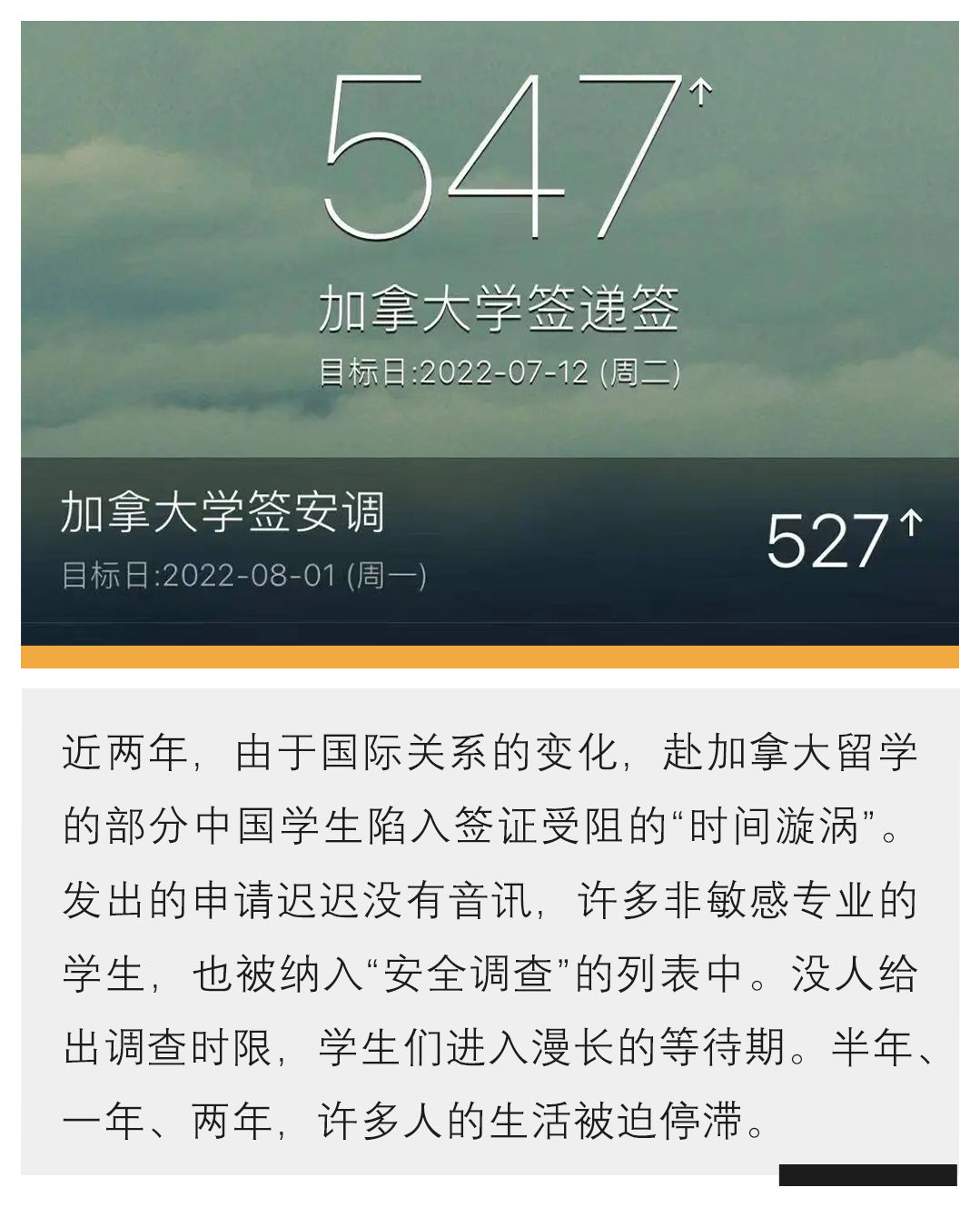 面临同样困境的赴加留学生们在各种群聊互通消息。他们自嘲,等待学签就像“开盲盒”,没人能预料自己的命运。一位已经等待近两年的学生前后加入了3个微信群,其中有两个都是满员。没人知道具体受影响的学生数量有多少,但可以确定的是,范围在逐步扩大。