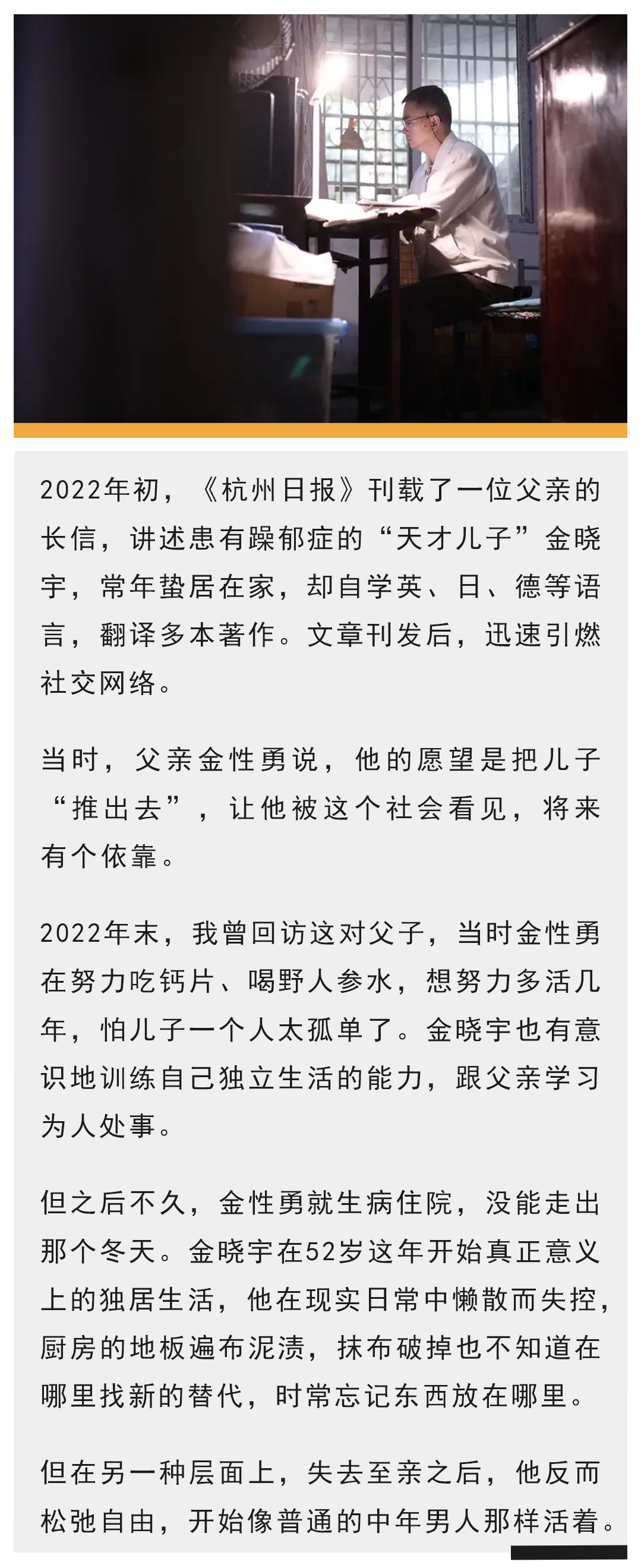 2021年10月,金晓宇因躁郁症再次住院,那时他的母亲已经躺在病床上完全无法行动。金性勇在帮妻子喂饭、翻身的间隙,手写了一封长信,寄往《杭州日报》的副刊,将自己的“天才儿子”,一个在过去十几年来,翻译英、日、德多语言的译者金晓宇“推出去”。文章发表后,迅速在社交网络上引起热议。金晓宇也成为了浙江省翻译协会的一员,“有组织有团体”,有了依靠。