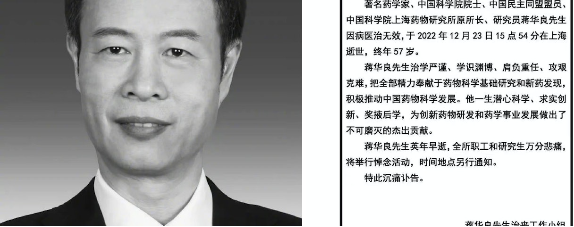 中科院上海药物所24日发讣告称著名药学家、中国科学院院士、中国民主同盟盟员、中国科学院上海药物研究所原所长蒋华良先生因病医治无效,12月23日15点54分在上海逝世,终年57岁。蒋华良和其牵头团队在2020年疫情爆发之初,称双黄连口服液可抑制新冠病毒,引发疫情以来第一波的中药抢购潮。
