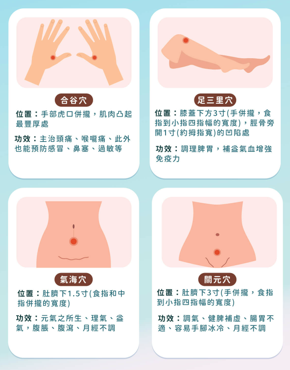 孕妇、2 岁以下幼童、糖尿病人、正在发烧或有发炎症状、局部皮肤有伤口等,就不适合敷贴。「夏天贴过三伏贴的人,冬天可再接受三九贴,对于虚寒体质造成的呼吸道与肠胃道不适症状者,具改善效果。」按压 4 穴位强化免疫力平常可按摩 4 穴位来做保健,就可强化免疫力,就算面对寒流来袭,也不怕疾病发生。她说:「每天按压以下穴位 5〜10 次,轻按至有痠胀感即可」。