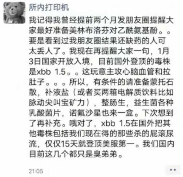 日前,内地网络流传一张「关于XBB1.5毒株在美国登顶,大家要屯点蒙脱石散、整肠生、诺氟沙星」的朋友圈截图。内容称目前海外最强毒株为XBB 1.5,主攻心脑血管和肠胃疾病。「所以,有条件的请准备蒙脱石散,补液盐(或者买两箱电解质饮料比如脉动尖叫宝矿力),整肠生,益生菌各种乳酸菌片,诺氟沙星也来一盒。」