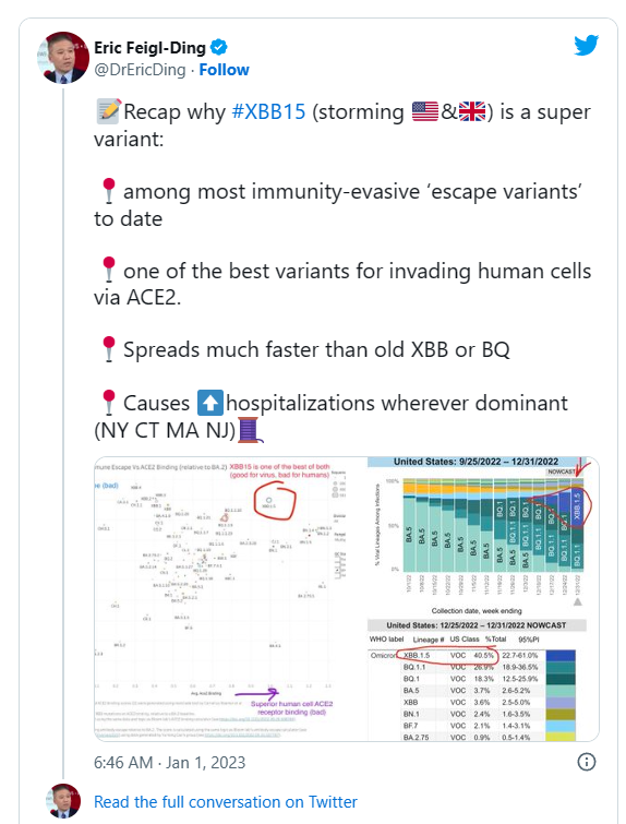 美国流行病学家兼卫生经济学家丁亮(Eric Feigl-Ding)1月1日称,美国就新一波XBB.1.5疫情发出的警告不足。他指因为现时全国污水的新冠病毒水平是自疫情爆发以来的第二高,东北部地区污水的新冠病毒水平更是特别高,而全国污水的新冠病毒水平仍在上升。