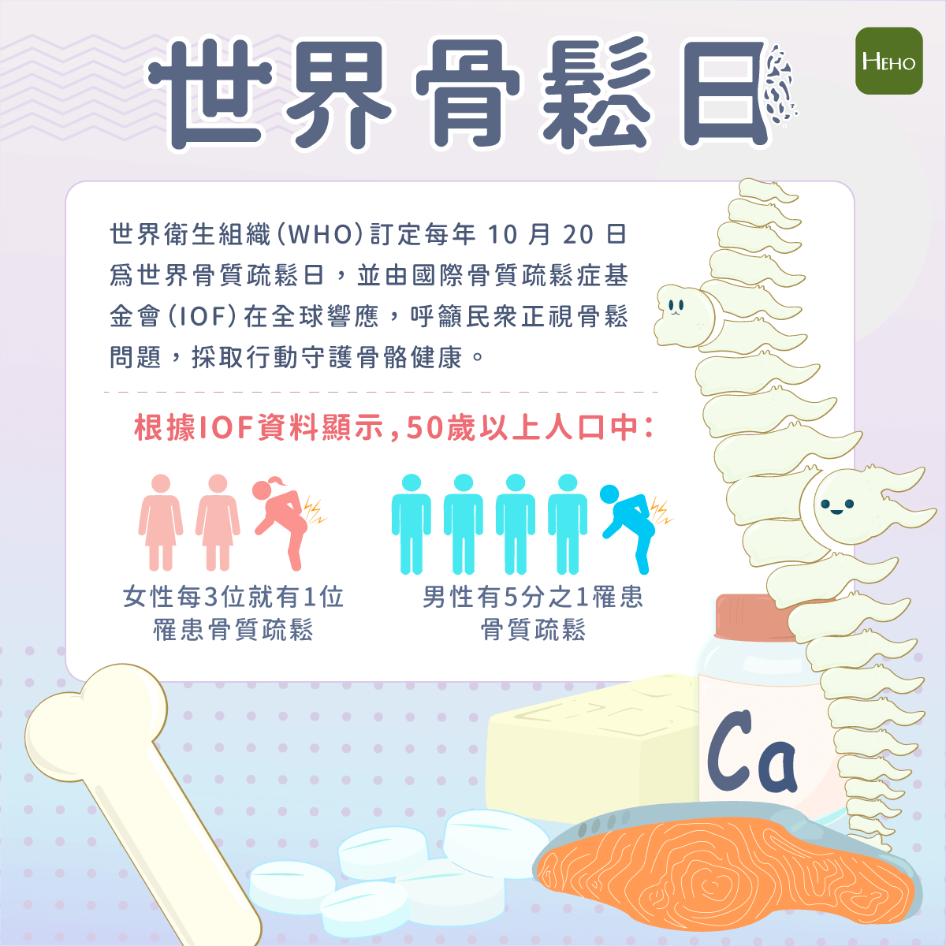 世界卫生组织(WHO)订定每年 10 月 20 日为世界骨质疏松日,并由国际骨质疏松症基金会(IOF)在全球响应,呼吁民众正视骨松问题,采取行动守护骨骼健康。