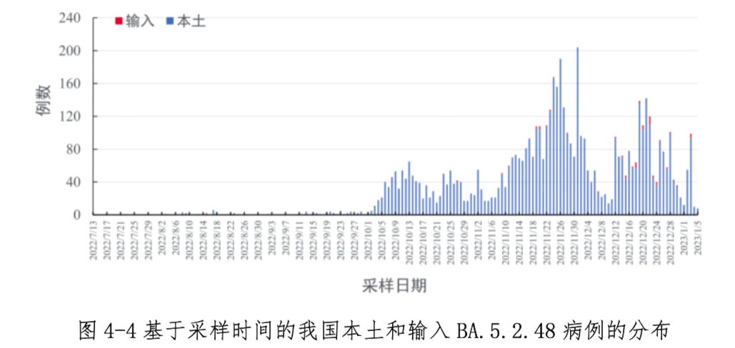 《概述》总结了BF.7.14及BA.5.2.48变异株的流行情况。测序结果表明,输入病例中,BF.7.14占BF.7的37.4%,主要集中在2022年12月,最早报告时间为2022年9月25日。本土病例中,BF.7.14占BF.7的96.7%,最早报告时间为2022年9月27日。