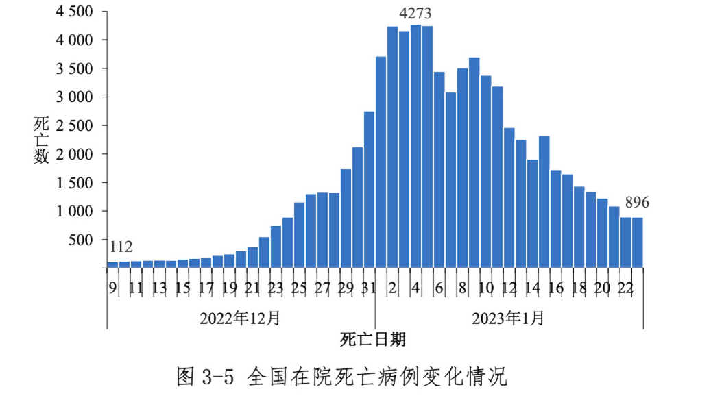 在院死亡病例数于1月4日达到每日峰值4273人,1月23日回落至896人。(China CDC weekly)