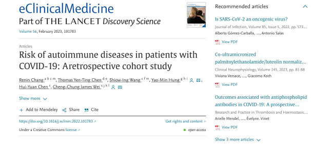 此外,建议临床医生在治疗新冠肺炎急性或康复期患者时,应同时留心观察自体免疫疾病的症状,必要时抽血检测 ANA、RF、CRP、ESR 等自体免疫疾病相关检验,该篇研究结果将于今年 2 月刊登于国际知名期刊《柳叶刀》子刊《eClinical Medicine》。