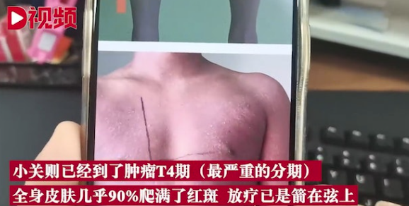 广东深圳23岁男子小关自12岁起身上就总是有白色皮屑,辗转在各大医院求医6年亦不见有起色。直至大学1年级时,才知道自己原来患上「蕈样霉菌病」的肿瘤。(《西部决策》微博影片截图)
