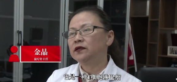 放疗科主任金晶表示蕈样霉菌病是1种皮肤T细胞淋巴瘤,一般表现为红斑、脱皮、干痒等。(《西部决策》微博影片截图)