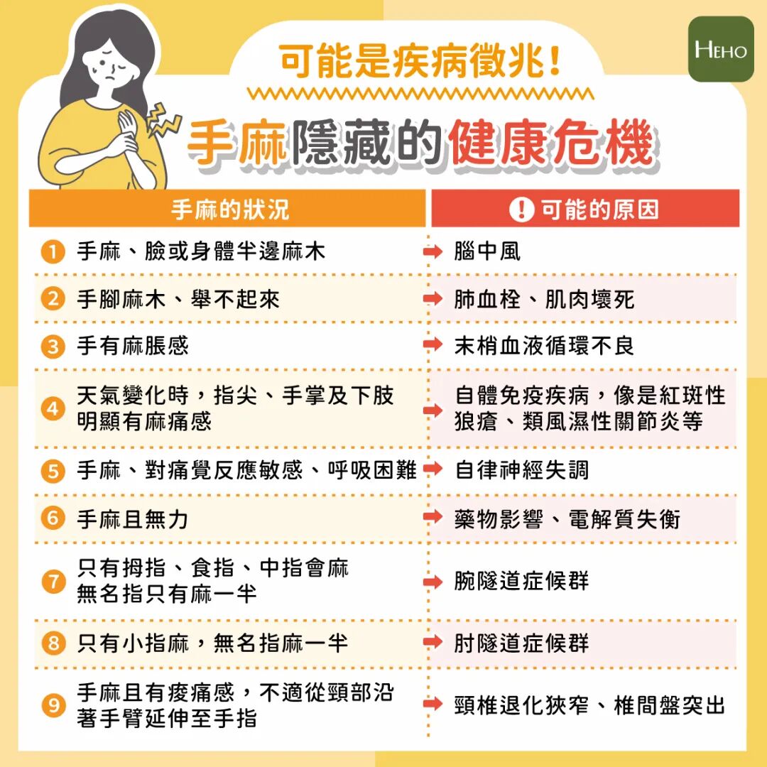 当然,手麻的原因很多,并非所有手麻都是因自律神经失调而引起。提醒各位有手麻问题的人,要多注意一下自己的身体状况,到底是哪几只手指会麻?哪个部位会麻?手背麻还是手掌侧麻?提供越多信息,对于医生的诊断越有帮助。