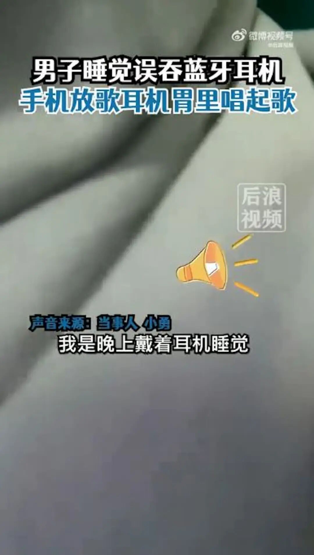 7日,在山东省济南市,男子小勇因在睡前戴着耳机听歌不小心睡着,半夜起来上厕所时发现耳机不见了,便拿起手机播点开音乐进行播放,听到自己肚子里传出歌声,才惊觉自己在睡梦中误吞了自己的蓝芽耳机。