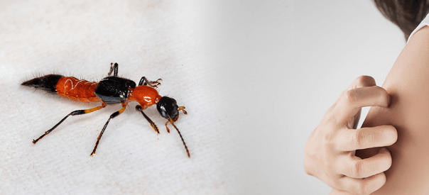 隐翅虫不会蛰咬人,不过隐翅虫危险的地方在于体内的毒液隐翅虫素(paederin),具有腐蚀性,只要碰触到隐翅虫的体液约10-15秒就可能会产生严重的灼伤,接触后 24 小时左右会产生线性特征的皮肤反应,称为隐翅虫皮炎,又称线状皮炎(dermatitis linearis)。接触到隐翅虫素(paederin)后,皮肤可能会感到灼热、刺痛、红肿,甚至产生水泡等等。