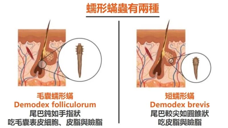 毛囊蠕形螨:尾巴钝如手指状,会吃毛囊表皮细胞、皮脂以及脸脂。卵呈现箭头状。