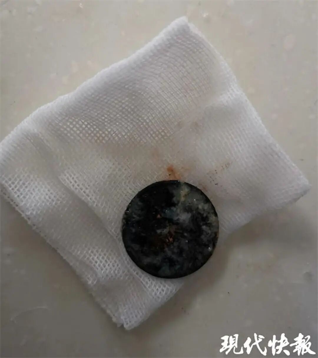 医生将患儿食道中的5毫硬币钳取出。硬币锈迹斑斑,部分发黑。(现代快报)