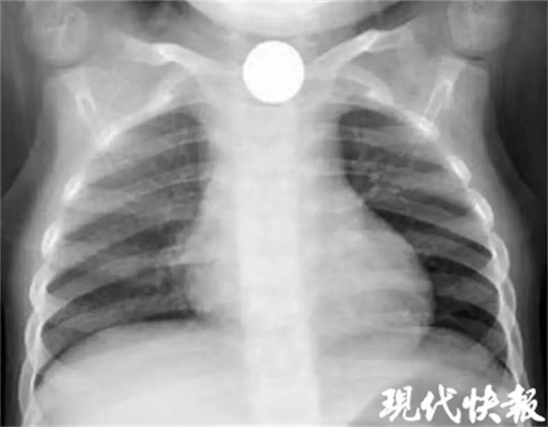 X光片显示患儿颈胸部有一个圆形金属阴影。(现代快报)