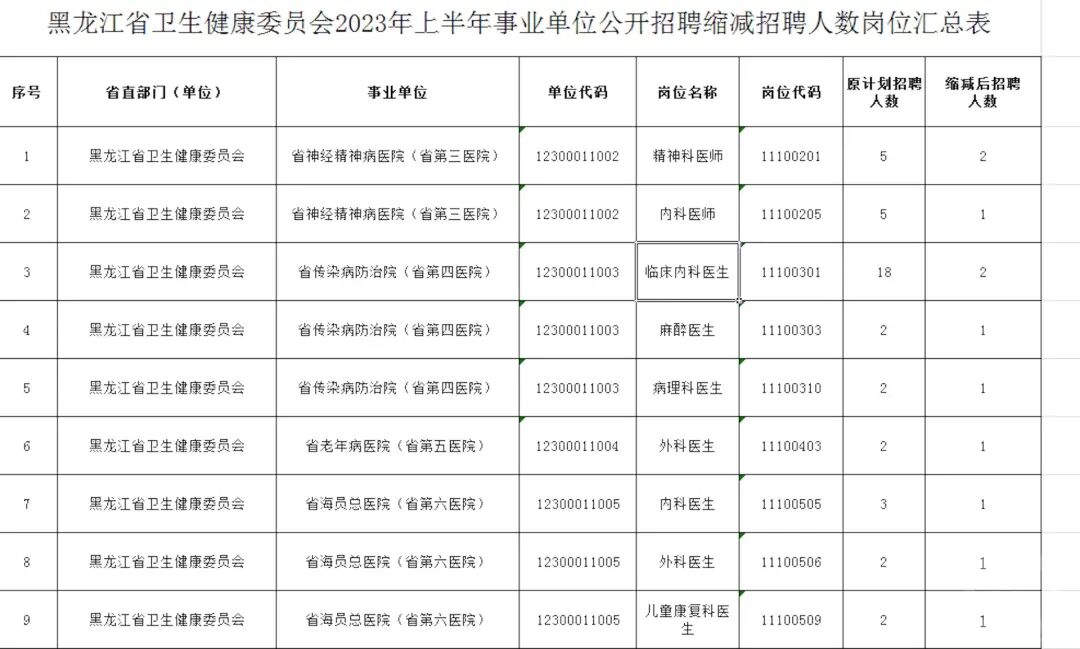 从缩减岗位来看,原计划招聘多人的岗位,缩减后普遍只招聘1-2人,譬如黑龙江省神经精神病医院原本各招聘精神科医师、内科医师5名,缩减后各招聘2人、1人; 黑龙省传染病防治院临床内科医生,原计划招聘18人,缩减后仅招聘2人。